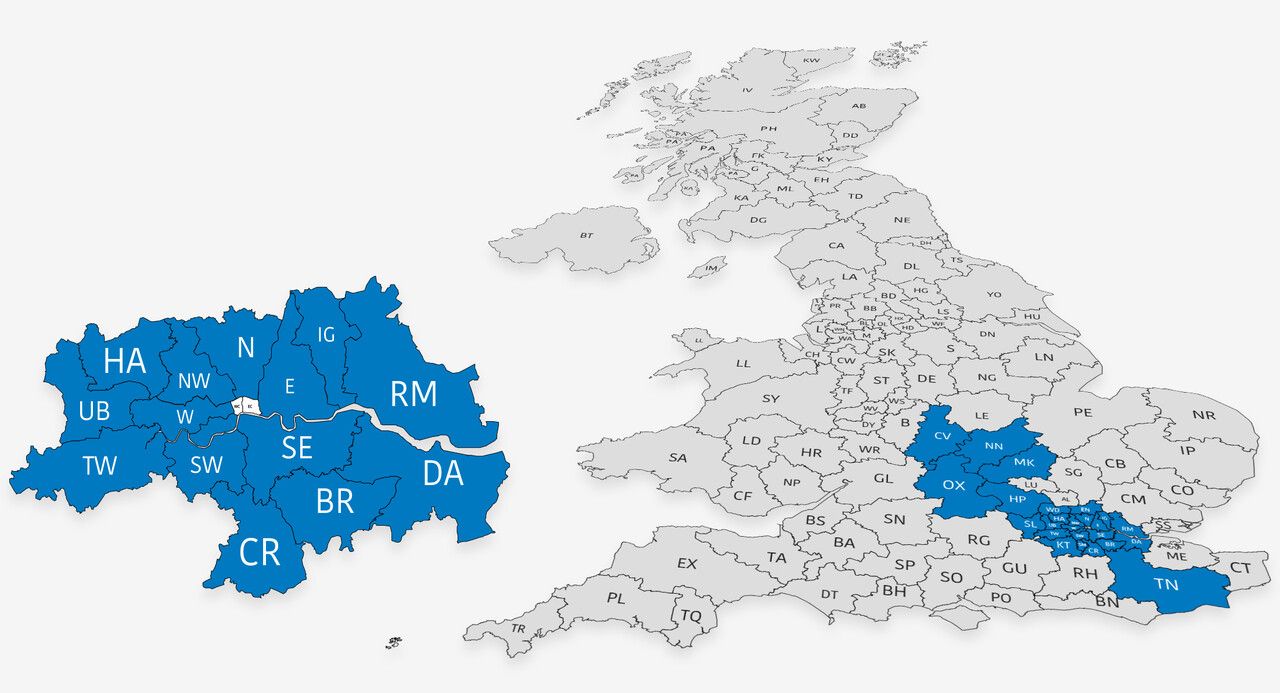 AL, E, EC, EN1, EN10, EN11, EN2, EN3, EN4, EN5, EN6, EN7, EN8, EN9, GU14, GU15, GU16, GU17, GU18, GU19, GU20, GU21, GU22, GU23, GU24, GU25, GU46, GU47, HA, HP, IG, KT, KT1, KT10, KT11, KT12, KT13, KT14, KT15, KT16, KT19, KT2, KT21, KT22, KT23, KT24, KT3, KT4, KT5, KT6, KT7, KT8, KT9, LU, N, NW, OX39, OX49, OX9, RG1, RG10, RG12, RG2, RG30, RG31, RG4, RG40, RG41, RG42, RG45, RG5, RG6, RG9, SE1, SE10, SE11, SE16, SE18, SE28, SE7, SE8, SG1, SG13, SG14, SG2, SG3, SG4, SL, SW1, SW10, SW11, SW12, SW13, SW14, SW15, SW16, SW17, SW18, SW19, SW2, SW20, SW3, SW4, SW5, SW6, SW7, SW8, SW9, TW, UB, UB1, UB10, UB11, UB2, UB3, UB4, UB5, UB6, UB7, UB8, UB9, W, WC, WD